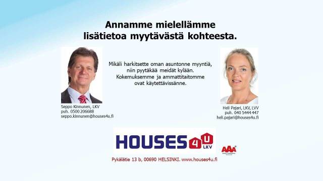 Seppo Kinnunen LKV, gsm. 0500 206688, seppo.kinnunen@houses4u.fi jolla on jo yli 46 vuoden monipuolinen kokemus kiinteistönvälitysalalta.