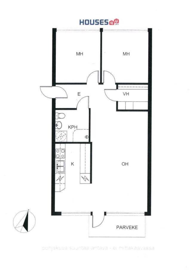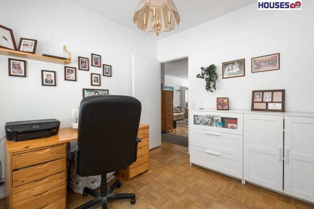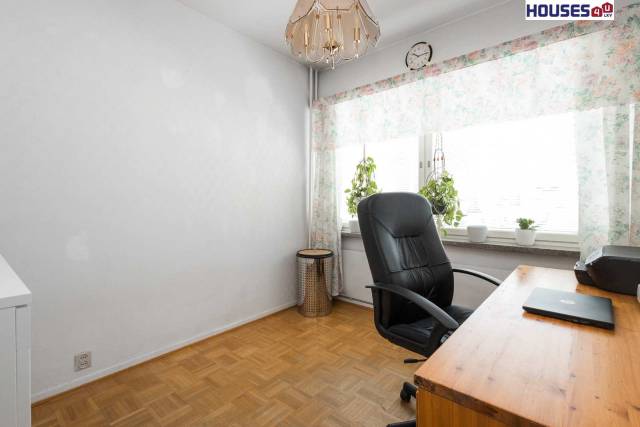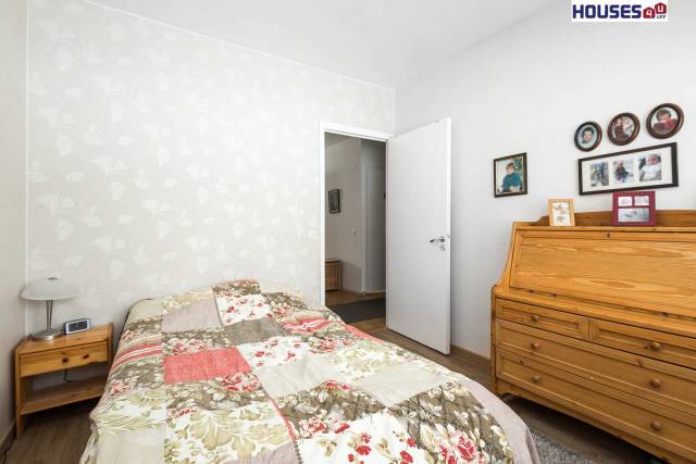 | Makuuhuone | Ikkunat luoteeseen, rauhalliselle sisäpihalle. Lattia toisessa makuuhuoneessa mosaiikkiparkettia ja toisessa laminaattia. |