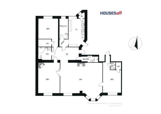 | Lisätietoja pinta-alasta | Pinta-alatieto perustuu yhtiöjärjestyksessä ja isännöitsijäntodistuksessa mainittuun pinta-alaan. Pinta-alaa ei ole tarkistusmitattu. Yhtiöjärjestyksessä 4h+ph+k+2wc+kh/wc (nyt oh:n väliseinä purettu). Mahdollisuus erilliseen yksiöön omalla sisäänkäynnillä ja wc/sh. |